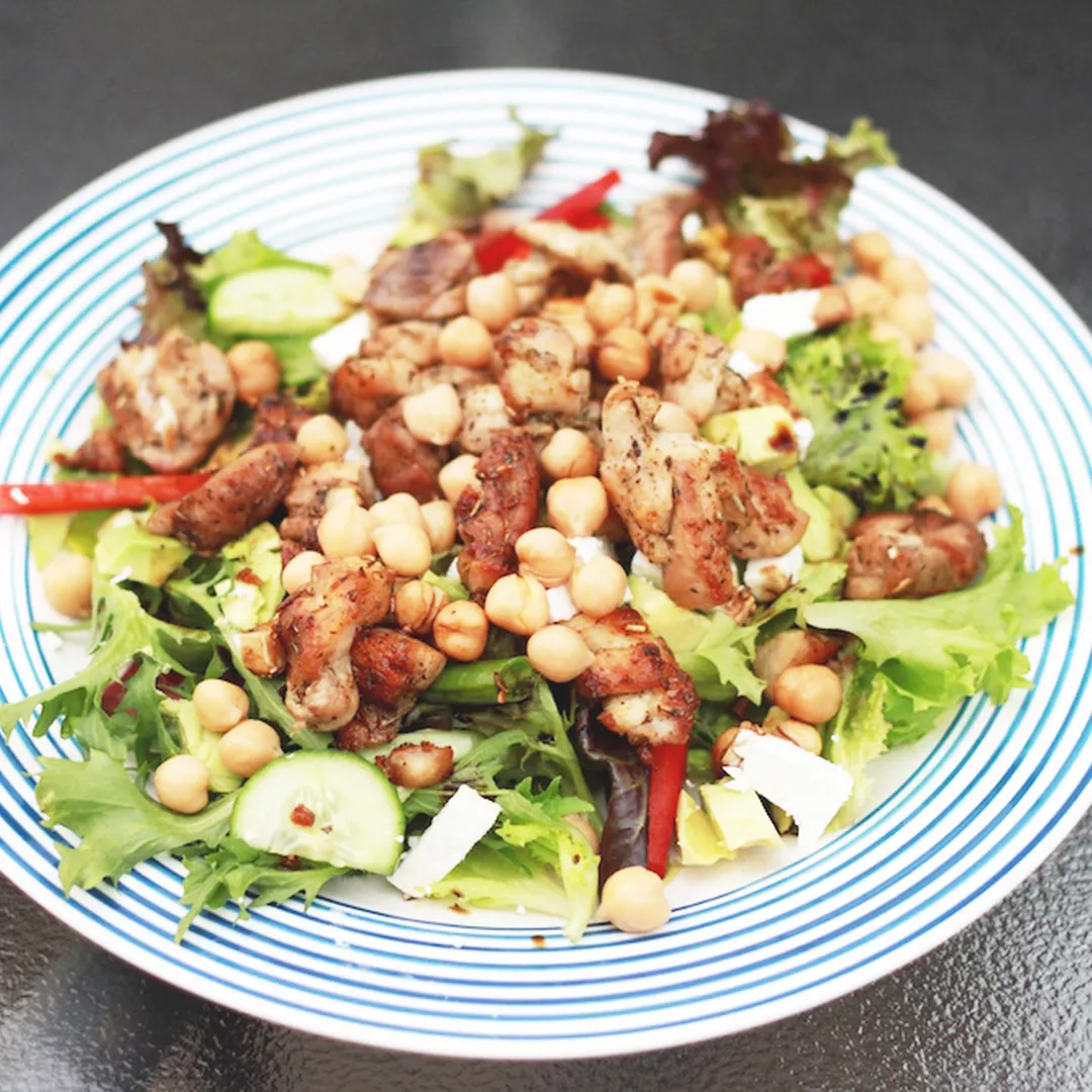 Meanwhile, evenly distribute the salad leaves, cucumber, red capsicum, avocado, feta and chickpeas over four plates.